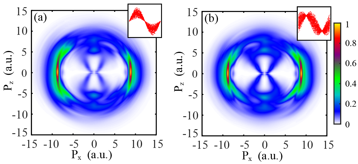 图2 (a)相位压缩相干态下的质子动量分布; (b)振幅压缩相干态下的质子动量分布。