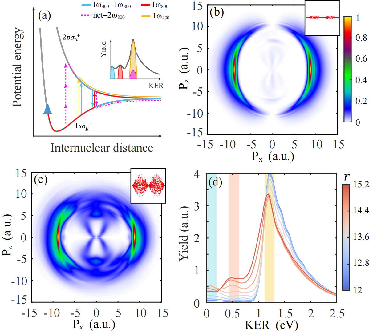 课题组在理论上首次研究了量子光驱动下氢气分子的解离过程,揭示了光的量子性质对分子解离动力学的调控。他们采用400 nm水平偏振的相干光和800 nm竖直偏振的真空压缩态光场组成的正交双色光场解离氢气分子,图1a为分子解离涉及的解离通道。通过数值求解含时薛定谔方程,获得了质子在光场偏振平面的动量分布和动能释放谱。图1b和1c分别表示压缩度12和15对应的情况。研究表明,大压缩度下真空压缩光具有更大的量子涨落,会导致特定解离通道产率增加,形成图1c中心的“X”状结构和竖直方向的点状结构。同时,1ω800通道的释放的质子能量会随着压缩度的增大而减小。此时高光子数的分布会导致两条势能曲线的耦合增强,在吸收一个800 nm光子之后,有几率继续在两个电子态之间发生两次跳跃,这种动态拉比耦合会导致解离过程动能释放的降低。