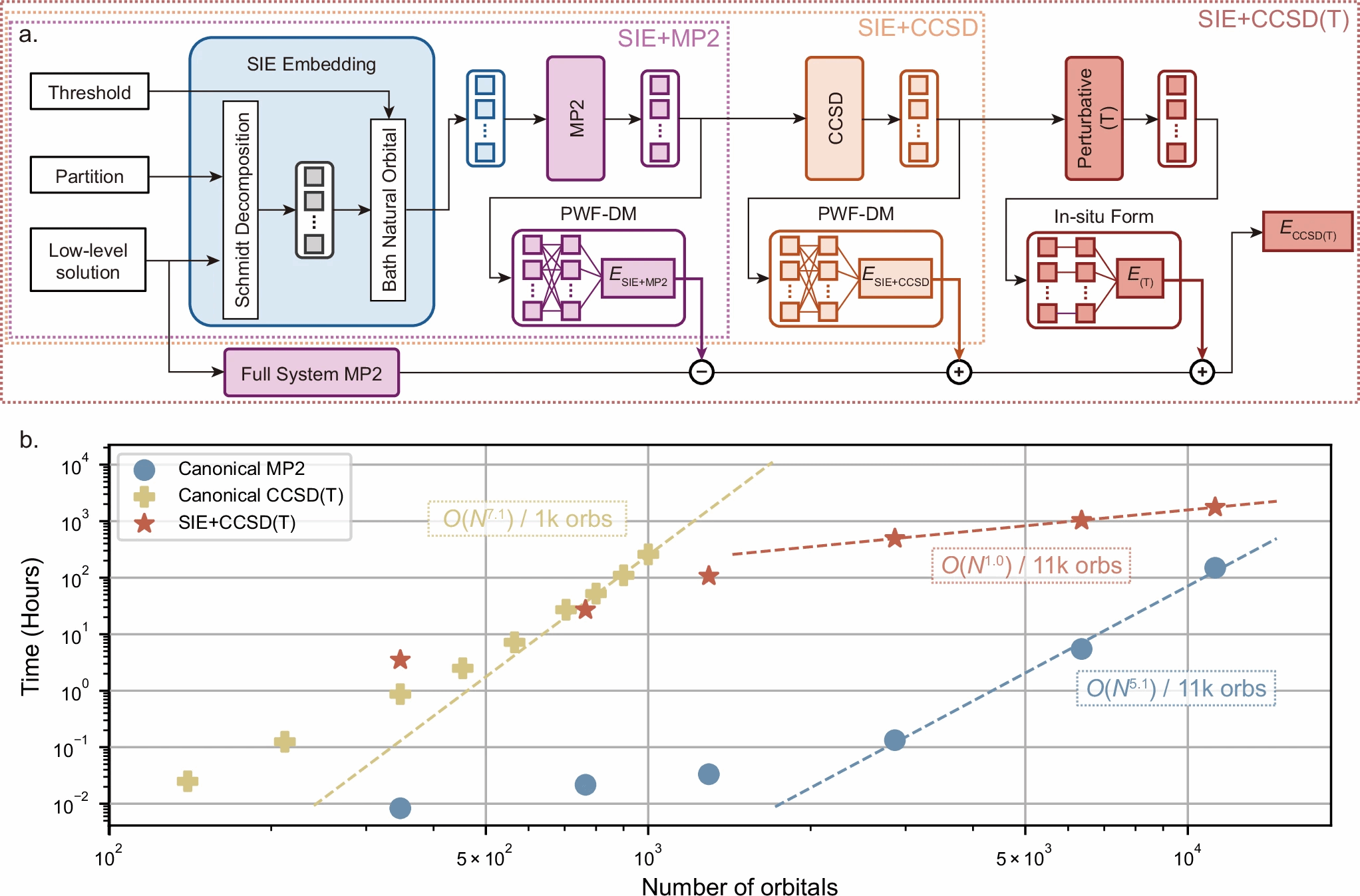 高精度的量子化学计算是化学反应研究、材料和药物设计的重要手段。但是,真正能给出“金标准”级别计算方法通常计算代价庞大,对于包含成千上万电子的表面化学体系难以实际应用。为此,研究团队采用一种能够“分而治之”的多分辨率计算框架(systematically improvable quantum embedding,简称SIE),先用较快、低复杂度的方法在全体系上做初步计算,再将整个系统按照初步计算的结果给出的重要性分割成多个小的区域,最后对这些区域进行更高精度的计算,直到量子化学“金标准”的“CCSD(T)”精度(图1),并把结果再拼接回整体,实现在同一框架内按需平衡速度与精度。“SIE+CCSD(T)”的算法框架通过全面的GPU 优化实现了计算性能的跨越式提升,整体计算复杂度随系统规模近似线性增长,在包含1.1 万个轨道的体系中依然保持高效运行,远超传统“CCSD(T)”计算所能实现的规模。这项工作为未来的材料设计、表面机理探索、乃至高精度高通量计算工作流打开了新的可能性。
