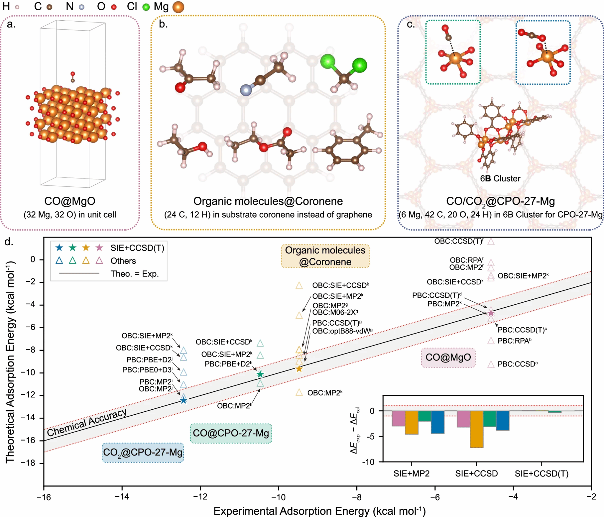 图2:(a)为CO+MgO(001)结构。(b)为CO/CO2+CPO-27-Mg。(c)为有机分子+石墨烯。(d)展示计算结果与实验和其他方法的对比。