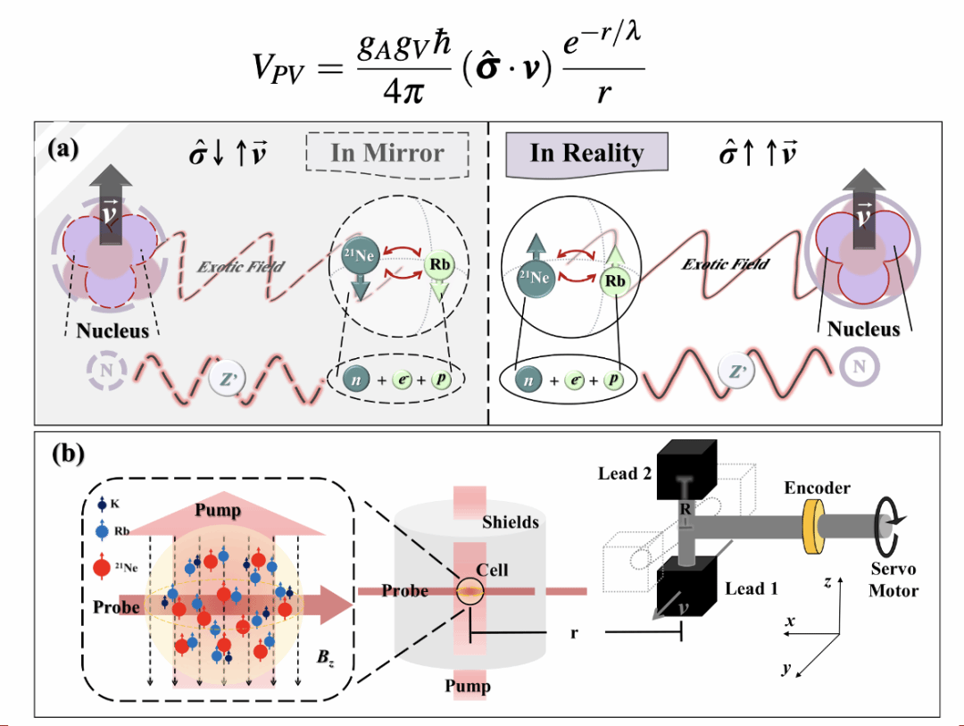 在已知四种基本相互作用之外,理论预言如果存在自旋为 0 或自旋为 1 的新玻色子,它们可能介导一种自旋相关的“第五种力”。其中,自旋为 1 的新玻色子通常记为 Z′ 粒子,其质量和性质与标准模型的 Z 玻色子不同。若此类粒子存在,将可能产生宇称破缺的自旋–速度相关相互作用(见图 1)。在镜像变换下,该相互作用的速度与自旋方向关系会发生反转,与吴健雄实验中电子出射方向与核自旋方向的关系高度类似。