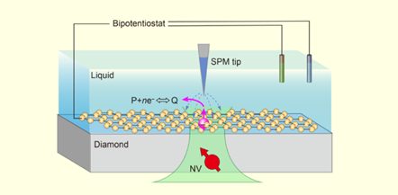 图1 量子显微镜技术(NV-SPM)的示意图,由金刚石色心量子传感技术与扫描探针显微镜(SPM)技术交叉融合而成。该技术可在固-液界面以纳米精度控制水分解并探测分解过程中的基本步骤。来源:美国物理学会《物理》杂志“观点”文章。