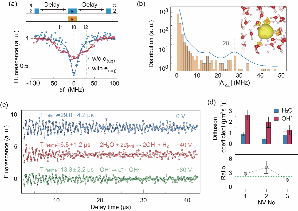 图2 a)单个NV的DEER测量。当产生eˉ(aq)时,在f1=1.513 GHz和f2=1.574 GHz处出现两个伴峰,来源于eˉ(aq)与周围质子的超精细相互作用。b)DFT计算得到的超精细相互作用|Azz|值分布,在28 MHz附近显示了极大值。插图:模拟所得的eˉ(aq)代表性结构之一。c)不同针尖偏压下单个NV的XY8-4关联谱数据,其衰减速度表示H₂O和OHˉ中质子的扩散速度。d)界面H₂O和OHˉ中质子扩散系数比值。来源:美国物理学会《物理评论快报》论文。