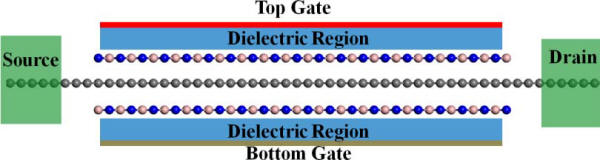 基于BN片/石墨烯/BN片三明治结构的双门场效应管。(上图) 模型示意图,