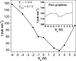 (左下图)透射谱,(右下图)转移曲线。插图为单层纯石墨烯的转移曲线。