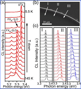 近年来,他们充分利用电子束激发的阴极荧光光谱(CL)的高空间/高能量分辨特性,系统研究了弯曲应变对半导体纳米/微米线材料的电导、发光,尤其是精细电子结构的显著调制作用,又取得了一系列重要研究进展。他们首先在液氮温度下研究了自由弯曲状态下的不同直径的ZnO纳米线的激子发光峰的能量与应变分布的相互关系,发现其发光峰能量与纳米线沿轴向方面上弯曲应变的分布非常敏感,即弯曲曲率半径越小,应变越大,对应的发光峰能量、半高宽也随之变化(Xiaobing