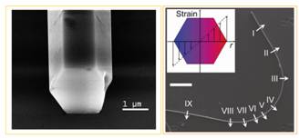 图1左:ZnO微米线中的应变梯度效应:具有六