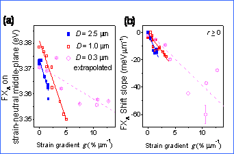 弯曲应变是一种非均匀应变,其最大特点是存在着线性的张-压应变梯度β,该应变梯度被定义为弯曲曲率半径的ρ倒数,它能够反应弯曲时应变的分布情况。电子束激发的阴极荧光光谱具有极高的空间/能量分辨本领,为研究应变梯度效应提供了可能。他们选择直径数微米的ZnO微米线,沿径向以100nm的步长进行线扫描,可以采集到数十条系列阴极荧光谱线,能够精准地把不同应变梯度下应变对发光能量的调制作用揭示清楚。图1为一根直径2.5μm、长数百微米的ZnO微米线,具有完美的六角多面体晶形(左)。利用微操纵仪使其弯曲,在不同的弯曲部位(对应于不同的应变梯度)选择8个线扫描位置,每个线扫描位置可以精确获得多达38条的CL谱线,在81K下每条CL谱线呈现两个主导的激子峰。实验发现,在两个自由端(即位置I、VIII),主导激子峰沿微米线直径方向都没有任何的变化。可是,随着微米线弯曲成不同程度(不同的应变梯度),两个主导激子峰的能量都会随着拉伸应变的增加而发生系统红移、随着压缩应变的增加而发生系统蓝移,不同直径的微米线都呈现出同样的规律。如果把不同直径微米线的A激子发光峰的能量与应变梯度的对应关系总结成图,发现发光峰的能量位移与应变梯度呈严格的线性关系,如(右)所示。该研究结果的最大创新点在于发现了应变梯度效应对半导体材料电子结构的显著调制,相关结果发表在材料领域的重要刊物Advanced