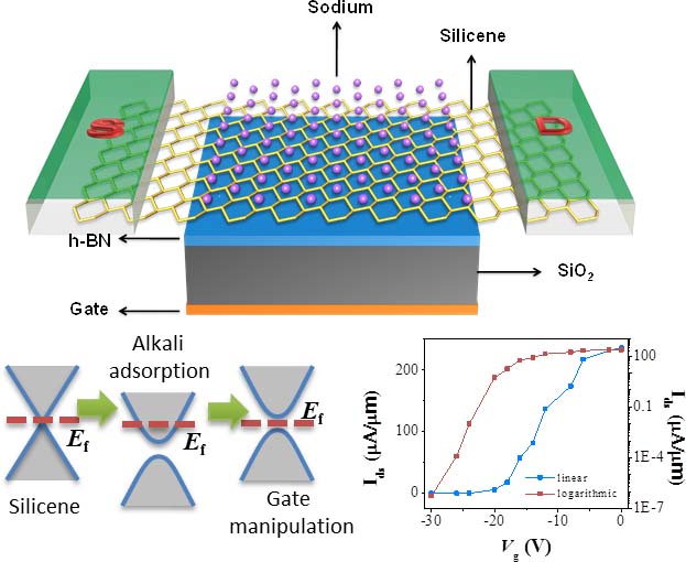 (左下图)碱金属吸附打开硅烯能隙以及门压对费米面的调控示意图,(右下图)器件的转移曲线。