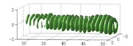 图1, 利用自匹配共振加速机制产生的高密度、螺旋结构、准直电子束(坐标单位为微米)。