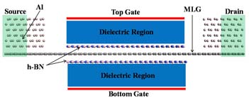 (左上图)单层石墨烯单门场效应管示意图,(右上图)六角硼氮片夹单层石墨烯三明治结构双门场效应管示意图,