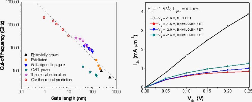 凝聚态所吕劲课题组通过第一性原理的量子输运模拟发现,亚10纳米石墨烯晶体管截止频率依然随沟道长度减小而反比增大,因此可以通过连续缩小石墨烯晶体管的沟道长度提高截止频率,最高可达几十太赫兹。如果设法打开石墨烯能隙(可通过六角硼氮片夹单层石墨烯(本组之前工作《NPG