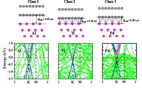 图1. 双层石墨烯与金属衬底接触三类界面各自代表性几何及电子结构。