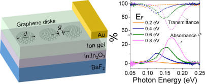 右图:FTIR测量的石墨烯纳米圆盘阵列(费米能级从0.2至0.8eV)的透射和吸收。