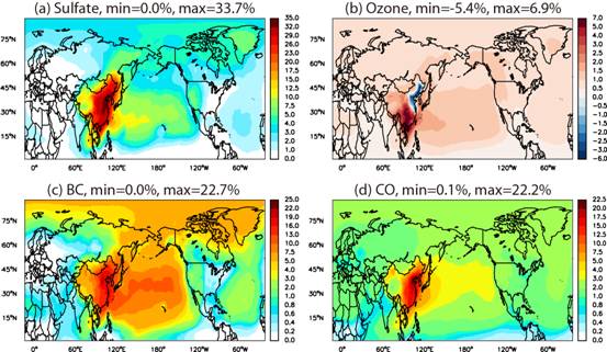度的百分比贡献:(a)硫酸盐颗粒物,(b)臭氧,(c)黒碳颗粒物,(d)一氧化碳。