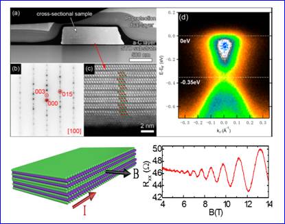 图1、 上:Bi2Se3纳米带的球差矫正透射电镜的原子分辨结构图像以及室温下测量的角分辨光电子谱ARPES (Nano Letters