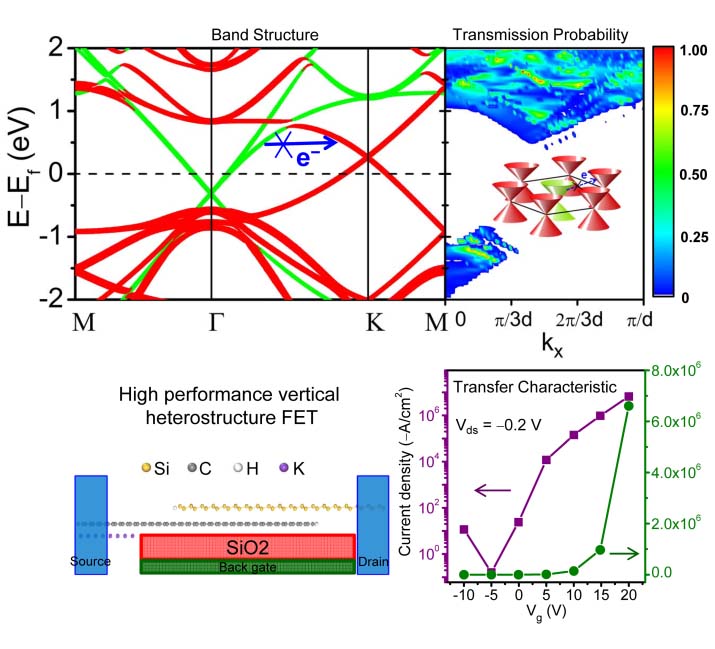 石墨烯/硅烯垂直异质结构的单门场效应管。(上图)原理示意图,(左下图) 模型示意图,(右下图)器件的转移曲线。