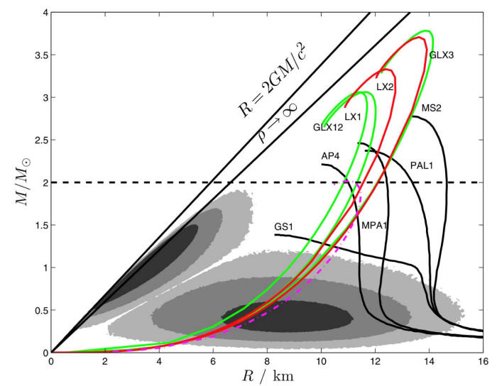 1746-37中致密星质量和半径的限制(图中深灰色区域的置信度达68%),并跟模型推测的质量半径曲线作对比。