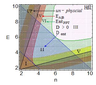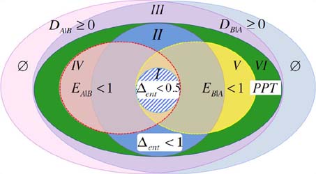 0为量子失协(quantum discord),PPT表征不可分量子纠缠E< (m+n-1)/m(n),e<1表征量子引导关联,其中a|b、