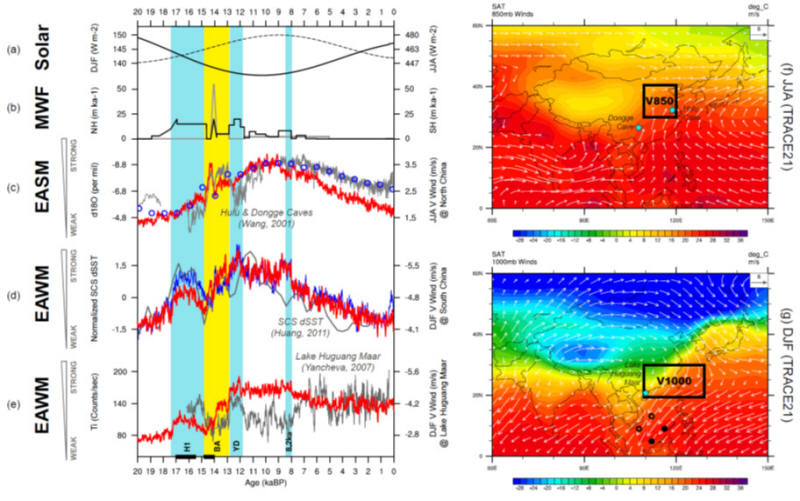 Yancheva et al. (2007) 观测东亚冬季风指数(灰)和模拟的按照Yancheva定义计算的东亚冬季风指数(红);(f)
