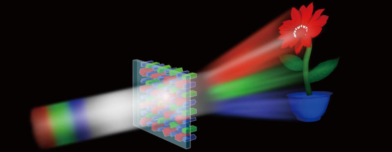 红绿蓝三色光照射到超表面高色差全息上,形成彩色图像