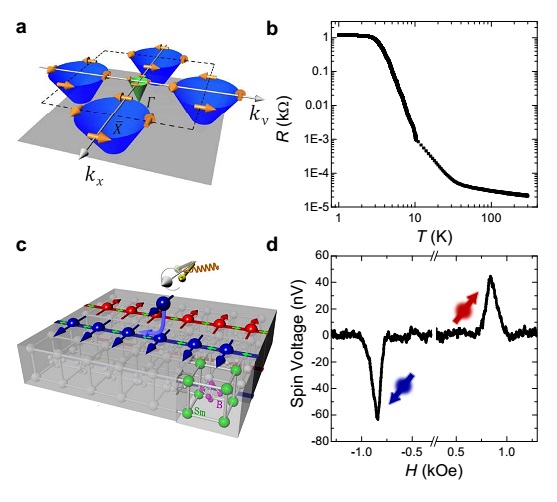SmB6表面态中的自旋注入和逆Edelstein效应。(a)SmB6表面态自旋动量锁定关系;(b)SmB6电阻随温度的关系;(c)自旋泵浦注入到SmB6表面态;(d)测量到的电压随磁场关系。在正磁场,自旋向上注入,产生正电压;在负磁场,自旋向下注入,产生负电压。