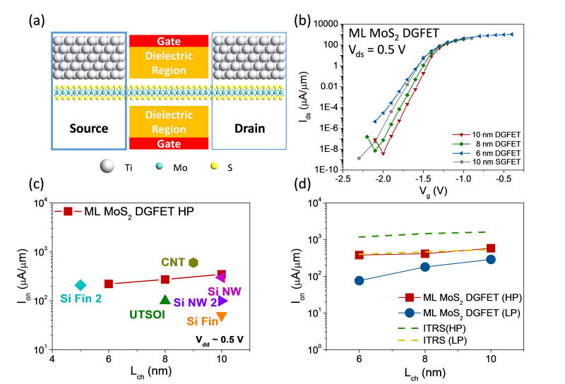 Ti电极亚10纳米MoS2双门场效应管模型图;(b)不同沟道长度和门数下的转移特性曲线;(c)亚10纳米尺寸下MoS2双门场效应管理论极限与实验上其他材料场效应管的性能对比;(d)与ITRS给出的高性能(HP)和低功耗(LP)类别下器件技术指标对比。