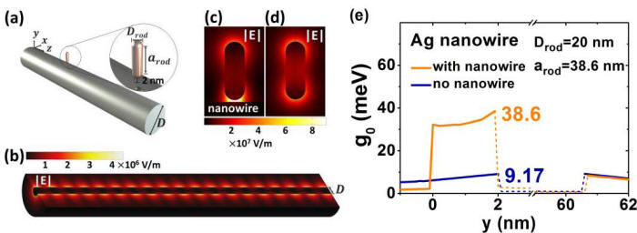 纳米线存在时和不存在时的金属纳腔的场分布,(e) 疏逝真空增强的耦合因子。
