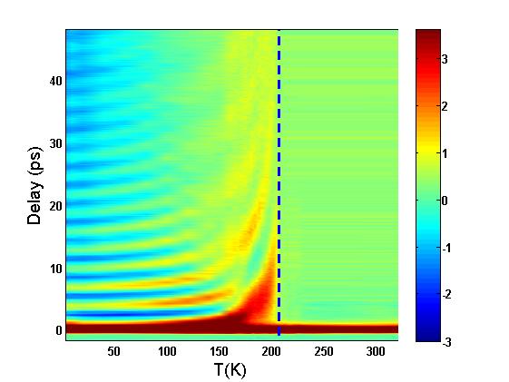 图形说明:不同温度下波长800 nm泵浦光激发所诱导的探测光反射率相对变化(以颜色强度表示)随时间延迟的依赖行为。