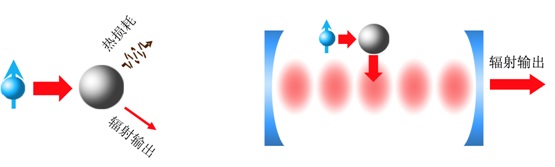本工作提出利用高品质因子光学微腔来调控金属颗粒的电磁场环境。相比于真空环境,光学微腔调制的电磁环境与等离激元共振模式有更强的耦合,增强了等离激元的辐射输出。高效的输出渠道使得能量不再集中于吸收区域,从而减小其热损耗。相比于真空中的金属颗粒,微腔调制的金属颗粒可以将单原子的辐射效率提升40倍,输出功率提升50倍。