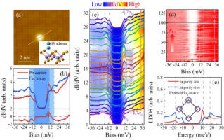为了揭示单层铁硒中的超导配对机制,王健研究组开展了一系列系统的实验。实验中的单层铁硒超薄膜采用分子束外延技术生长于钛酸锶衬底。通过原位超高真空(~10−10 mbar)原位扫描隧道谱探测,研究组发现超导能隙外存在由电子–玻色子耦合导致的鼓包(hump)结构。系统的扫描隧道谱实验揭示以该鼓包为特征的玻色模式更接近磁激发信号(图1),极有可能是充当配对媒介、且连接布里渊区近邻角落(M点)电子费米口袋的(π,π)自旋涨落。超导序参量作为复数,其在费米面上的分布存在同相位(保号:sign-preserving)与反相位(异号:sign-reversing)两种情形。杂质散射作为一种相位敏感技术,已广泛应用于以往超导配对研究。其中非磁性杂质尤为特殊,其选择性地局域破坏s±波、d波等异号配对,实验上表现为诱导超导能隙内的束缚态,而对传统保号s波配对无明显效应,因此可用于区分异号和保号配对图像。王健研究组采用沉积于单层铁硒表面的强非磁性杂质铅(Pb)吸附原子作为散射中心,实验中发现相对于正常超导谱形,铅原子在超导带隙边界附近诱导出电子型谱权重增强,同时超导能隙减弱(图2)。该特征是‘隐’束缚态的典型信号。系统的势散射强度调节(图2(d))等实验也印证了这一观点,有力地说明单层铁硒超导能隙函数存在异号。同时,基于异号配对图像,如扩展s±波(图2(e)),南京大学王强华教授与南京师范大学高绎教授理论上定性复现了非磁性杂质诱导的超导谱形重构。上述的玻色模式与非磁杂质散射两项研究成果一致支持单层铁硒中存在以自旋涨落为媒介的异号配对,为最终澄清单层铁硒的界面高温超导机制奠定了重要基础,同时也预示具有不同费米面构型的铁基高温超导体或存在统一解释。