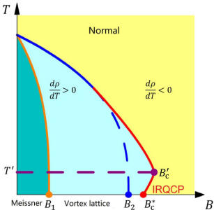| 图2 反常量子格里菲斯奇异性相图示意图。在自旋轨道耦合和超导涨落的作用下,平均场理论的相边界(蓝色虚线)向外突出形成新的相边界(红色实线)。当温度低于T^'时,红色实线代表反常相边界。沿着反常相边界趋于无限随机量子临界点B_c^*可以观测到反常量子格里菲斯奇异性。