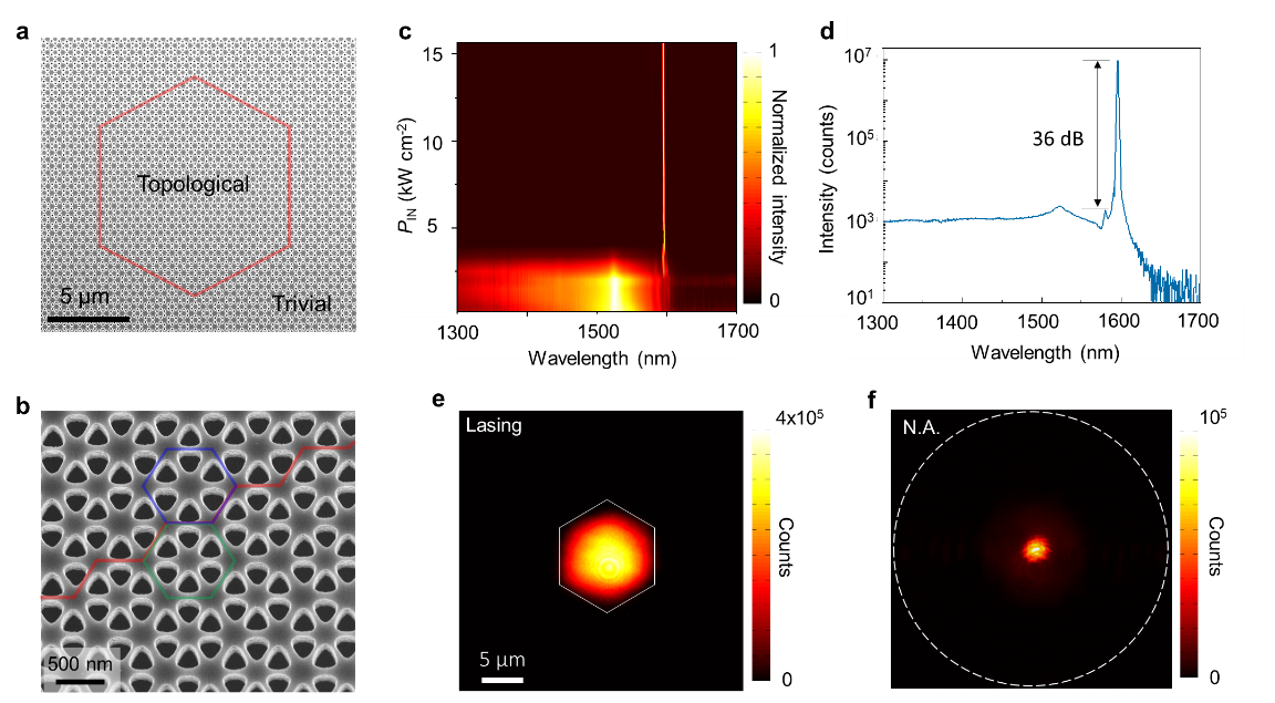 图2:拓扑体态激光器件与性能。(a-b) 拓扑体态激光器谐振腔(a)和拓扑界面处(b)的电镜图。(c)随功率变化的光谱。(d)激射光谱。(e)激射实空间近场分布。(f)激射角分辨远场分布。