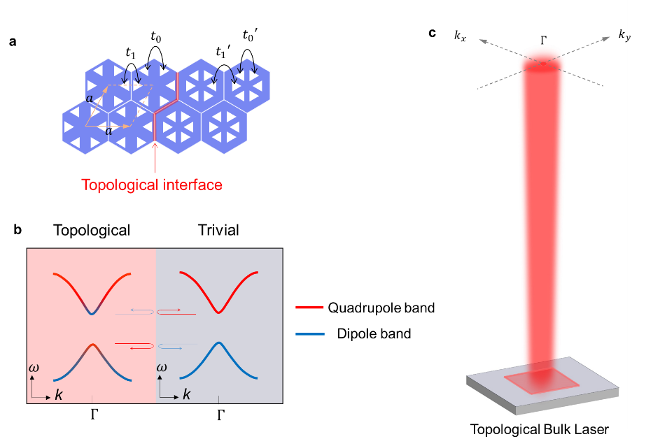 图1:拓扑体态激光器原理和示意图。(a) 用于构造能带反转的拓扑态和拓扑平庸态光子晶体示意图。(b) 实验中发现能带反转可用来实现光场的反射和限制。(c) 垂直发射拓扑体态激光器示意图。拓扑体态激光器出射方向垂直于光学腔反馈平面。