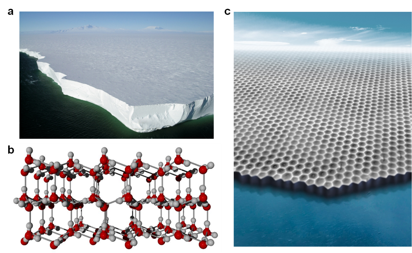 图1 (a)南极罗斯海上的厚冰层;(b)自然界最常见冰相(Ice Ih)的分子模型;(c)本工作发现的二维冰(实验结果的3D效果图)