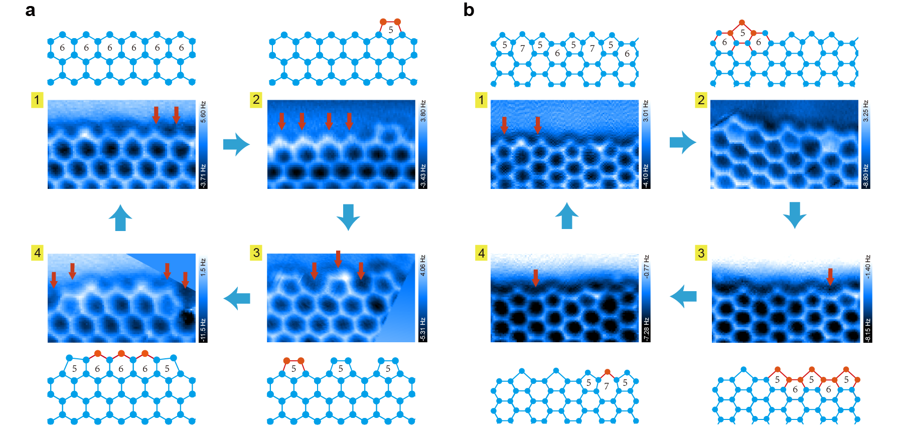 图3 二维冰岛的锯齿状(a)边界和扶椅状(b)边界对应的“搭桥”(bridging)式和“播种”(seeding)式生长模式。生长由1至4依次循环进行,原子力显微镜中的红色箭头表示水分子加入,球棍模型图中的红色结构表示水分子加入形成的新结构。图像尺寸分别为:(a)3.2 nm x 1.9 nm和 (b)3.7 nm x 2.2 nm。