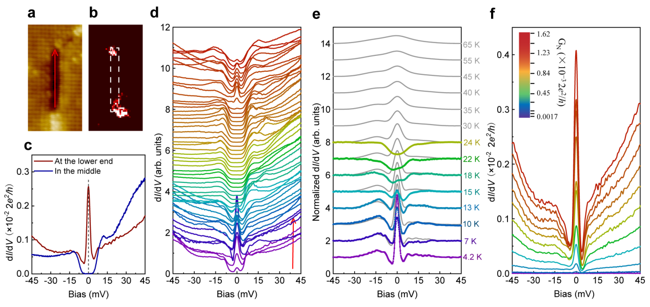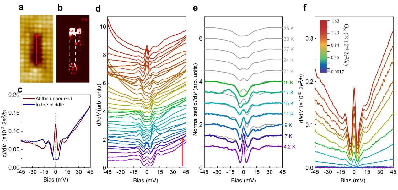 图1 一维长原子缺陷链两端的零能束缚态(约15个Te/Se原子长度)。a,一维长原子链缺陷的STM形貌图。b,零偏压电导成像图。c,一维原子链缺陷下端点和中间位置的扫描隧穿谱。d,沿一维原子链缺陷的扫描隧穿线谱(沿a中的红色箭头)。e,一维原子链缺陷下端的零能束缚态随温度的依赖关系。彩色曲线是实验得到的归一化隧穿谱。灰色曲线是由费米-狄拉克分布方程得到的高温卷积曲线。f,一维原子链缺陷下端的零能束缚态随隧穿势垒的依赖关系。
