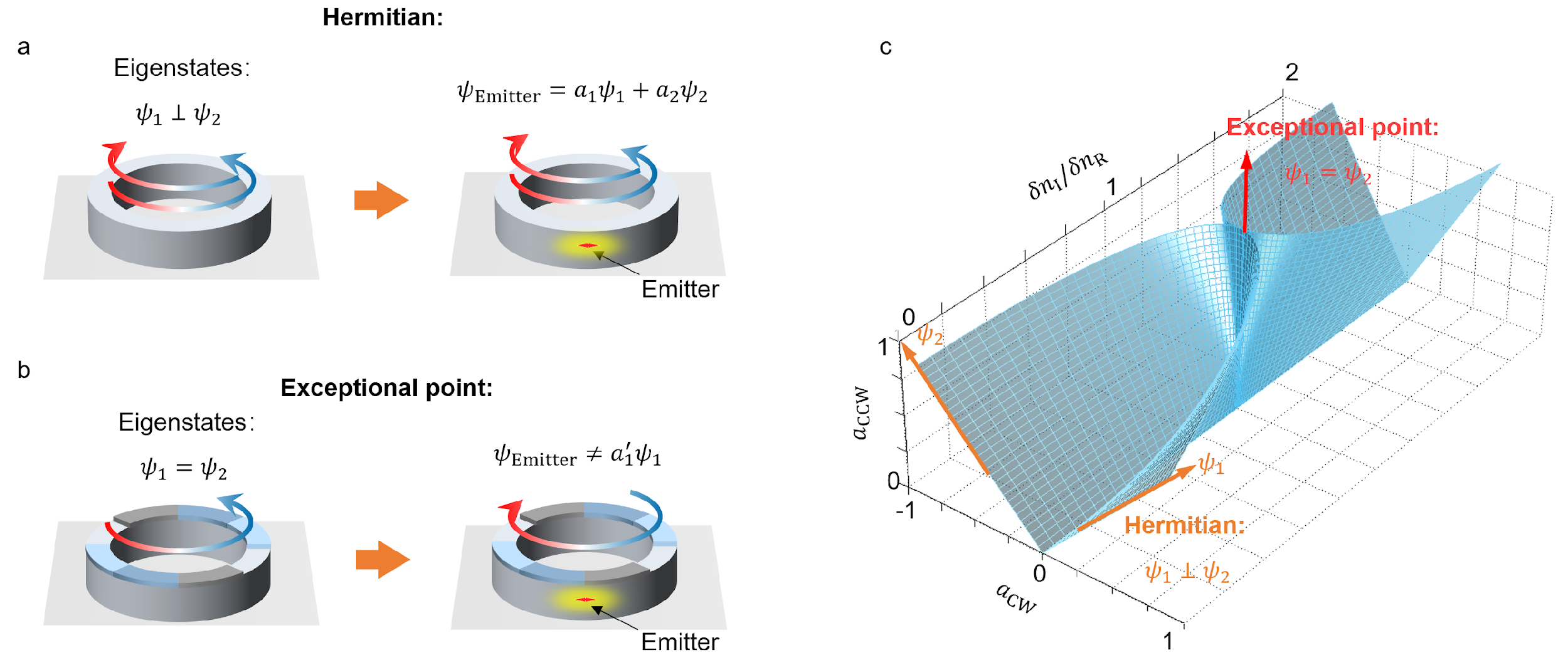 图1(a)普通环形谐振腔在一共振频率下有两个正交的本征态,处于共振频率的光源与其相互作用会同时激发出这两个本征态。(b)处于奇异点,共振频率上只存在一个逆时针传播本征态的环形谐振腔。处于共振频率的光源与其相互作用激发出了体系中不存在的顺时针传播的本征态。(c)环形谐振腔中本征态随着时间-宇称对称折射率调制的演化。在奇异点处两个本征态是完全平行的。