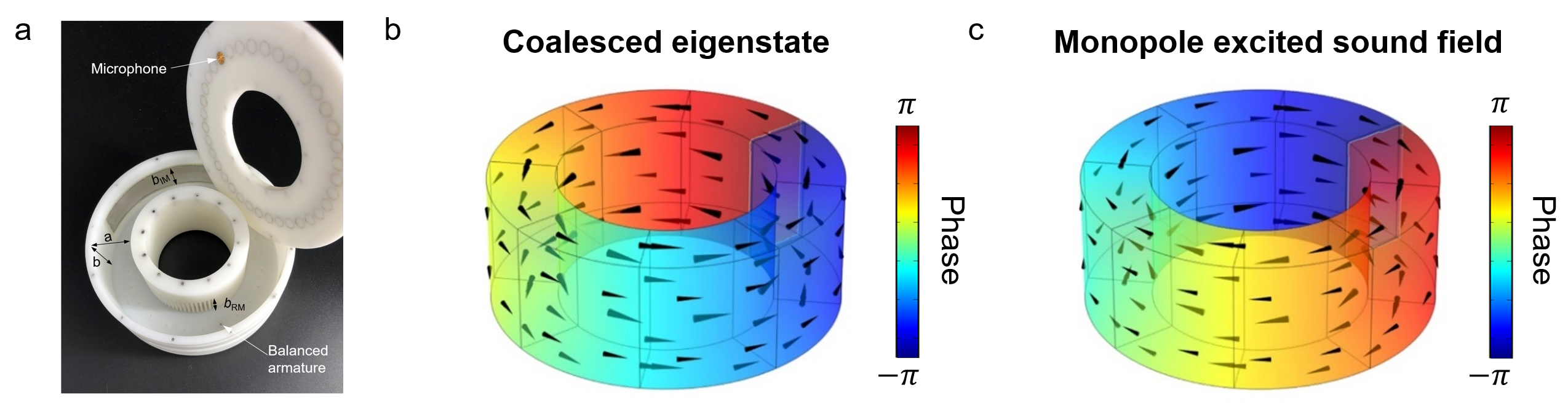 图3 (a)具有宇称-时间对称折射率分布的声学环形谐振腔样品。(b)和(c)奇异点处的腔体内部声场的相位及声能流方向。(b)为本征态,(c)为单极子激发声场。黑色箭头代表声能流方向。