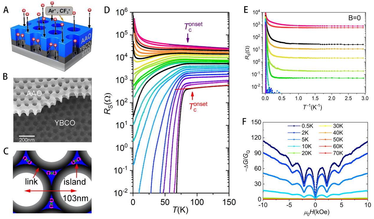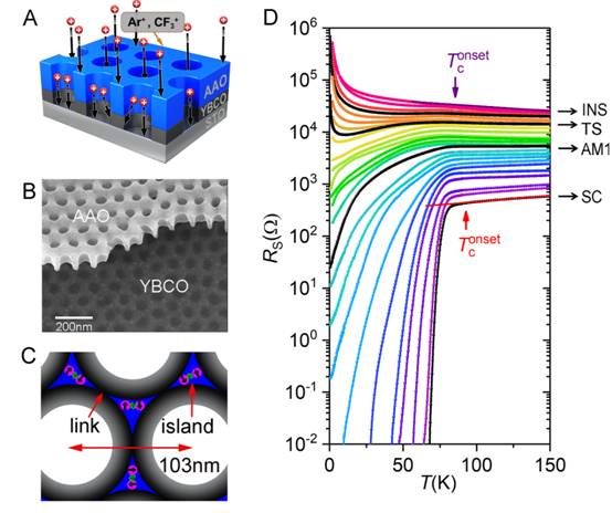 图一, 钇钡铜氧(YBCO)纳米多孔薄膜中的超导-量子金属-绝缘体量子相变。(A)用多孔氧化铝(AAO)模板蚀刻法制备YBCO纳米多孔薄膜的工艺示意图。(B) YBCO纳米多孔薄膜扫描电镜(SEM)图像。(C) YBCO纳米多孔薄膜的几何结构示意图。(D)不同刻蚀时间下YBCO纳米多孔薄膜的电阻对温度的依赖关系。超导态(SC)、反常金属态(AM1)、过渡态(TS)和绝缘态(INS)四种典型薄膜的电阻温度曲线用黑色表示。