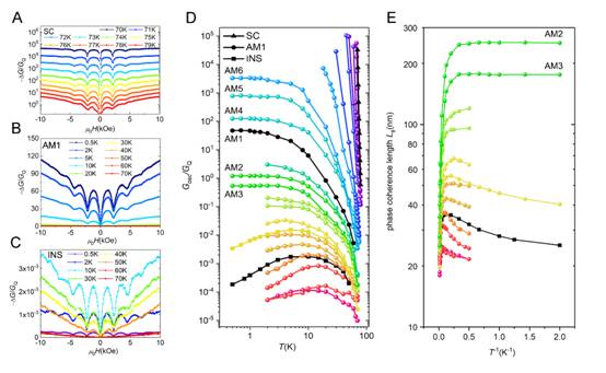图三,库柏对在量子相变过程中的相干性衍变 (A)超导态、(B) 量子金属态、(C)绝缘态的磁导振荡图。 (D) 不同温度下,所有YBCO薄膜的磁导振荡的振幅。对于量子金属态薄膜,磁导振荡的振幅随温度的降低在5 K左右而饱和。而超导态薄膜磁导振荡的振幅在低温下发散,绝缘态薄膜磁导振荡的振幅随着温度降低先增加后减小。(E) 通过相位相干的近似模型,计算得到量子金属态的相位相干长度在低温下饱和。揭示了量子金属形成的一种可能机制。