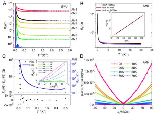 图二,量子金属态证据。(A)量子金属态薄膜和超导薄膜的输运曲线。其中低温下电阻的饱和行为为量子金属态的特征。(B) 量子金属态薄膜极低温输运曲线。是否采用高频滤波器并不改变量子金属态饱和电阻的特征。插图: 量子金属态薄膜的I-V曲线,符合欧姆定律,亦为量子金属态的证据。(C)典型量子金属态薄膜的霍尔电阻和纵向电阻随温度的变化图。霍尔电阻(Rxy)在低温下趋于零,而纵向电阻不为零,表现出量子金属态的特征。插图: 量子金属态薄膜不同温度下的霍尔电阻(Rxy)。(D) 量子金属态薄膜的巨磁阻效应,与理论上对量子金属态的预期相符。