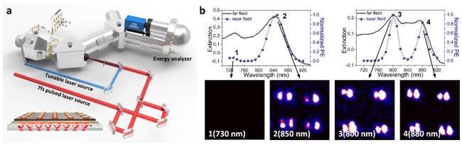 图1、(a)光电子显微镜和多层结构示意图,(b)远场和近场探测曲线、不同波长激光激发下光电子显微镜记录的局域表面等离激元模式分布图。