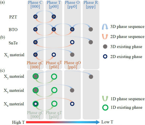 图1. 材料的相变序列(a) 满足标度律的传统铁电材料;(b) 不满足标度律的二维铁电材料;(c)