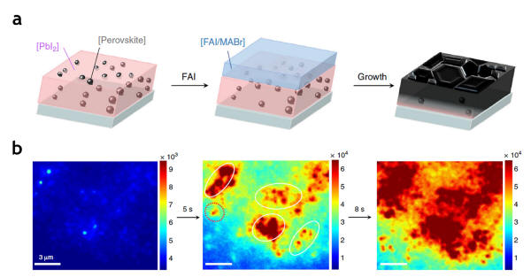 图1. a) 籽晶法制备钙钛矿薄膜过程示意图。 b) 光致发光显微原位探测籽晶法中钙钛矿实时生长过程。