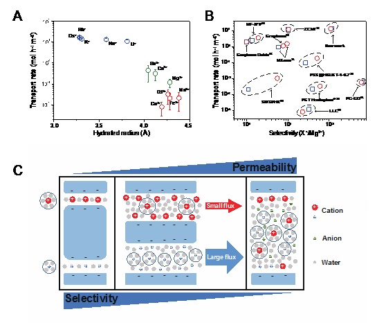 纳米孔道的离子输运现象是材料科学和生物物理等领域研究的热点。当纳米孔道的尺度达到纳米即接近分子大小时,将会出现许多奇异的输运现象。研究这些输运现象对于了解细胞膜离子通道机制,制备新型高效分离设备淡化海水、处理污水,探索新型DNA测序方法等都有重要意义。基于核径迹高分子膜制备的纳米孔具有结构坚韧富有柔性并且可以高效大规模制备的优点,但是由于已沿用六十多年的传统化学蚀刻制备法不便可靠控制蚀刻速率,无法达到亚纳米尺度。刘峰和王宇钢课题组基于多年来核径迹纳米孔研究工作的基础(JACS,2008,2009;AFM, 2010,2011; EES, 2011等),首次通过高能重离子轰击高分子膜并进行充分紫外线照射,不进行蚀刻而成功制备亚纳米尺度的核孔膜 (Qi Wen, et al., Advanced Functional Materials,2016, Cover Highlights)。该膜具有超高离子选择性,比如阴阳离子选择性高达108,但导通量离实际应用尚有一定距离。事实上,选择性和通量对于所有离子分离膜都是一对难以调和的矛盾。2017年《Science》专门就此发表题为“Maximizing the right stuff: The trade-off between membrane permeability and selectivity”的长篇评述文章,指出分离膜研究的正确方向是要同时具有高选择性和高通量。通过优选高分子膜并利用新的制备工艺,刘峰、王宇钢课题组所获得的新型纳米尺度核孔膜,在保持碱金属离子与重金属离子高选择性的同时,将离子的输运率提高了3个数量级 (图A)。 这种纳米核孔膜的优异分离性能突破了传统的分离膜和氧化石墨烯等新型分离膜的局限 (图B)。与此同时,他们还建立了高分子纳米孔模型并通过分子动力学模拟揭示,一方面由于孔的半径在0.5纳米左右极大减少了脱水势垒的阻碍从而极大提高了输运量,同时由于部分脱水的离子和表面吸附的电荷之间的相互作用而保持了高选择性 (图C)。 这项研究揭示了纳米孔道的离子输运新机制,并且为突破高选择性和高输运率的矛盾提供了新的思路。通过该方法所制备的高分子膜在过滤重金属元素的水净化,制备新型电池等方面也有重要应用价值。