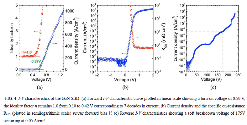 图2 GaN基SBD的I-V特性:(a)正偏I-V曲线展示0.59 V的开启电压和1.0的理想因子;(b)电流密度以及开启电阻Ron随正向偏压的变化;(c)反向偏压I-V曲线展示175 V@0.05 A/cm2的软击穿