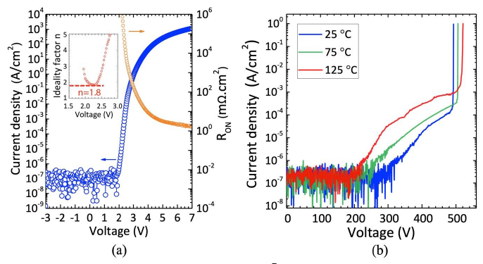 图3 GaN基PND的I-V特性:(a)电流密度以及开启电阻Ron随正向偏压的变化,内插图展示1.5~3.0 V范围的理想因子n;(b)不同温度反向偏压I-V曲线表明击穿来自碰撞电离雪崩倍增