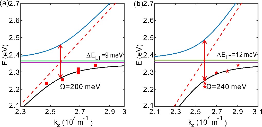 图2 腔内TM(a)、TE(b)模式色散关系理论分析与实验结果(红色散点)