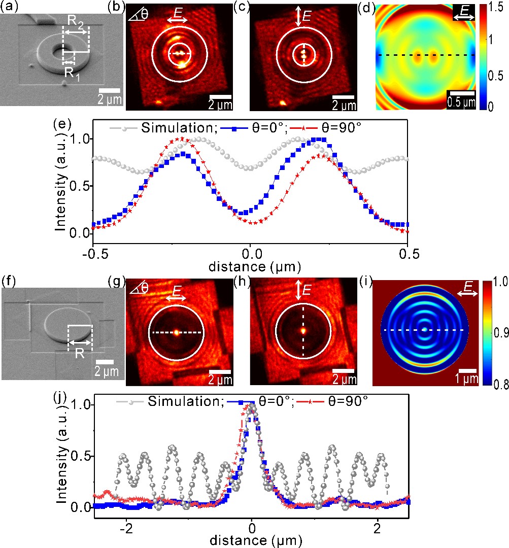 图3 钙钛矿微腔光学模式控制研究:(a)微环钙钛矿扫描电子显微(SEM)成像图;(b-c)腔内模式实验中亚禁带激发下微环钙钛矿光电子成像结果;(d)时域有限差分(FDTD)法数值分析结果;(e)腔内模式实验与理论数值分析对比;(f-j)对微盘钙钛矿微腔的研究结果